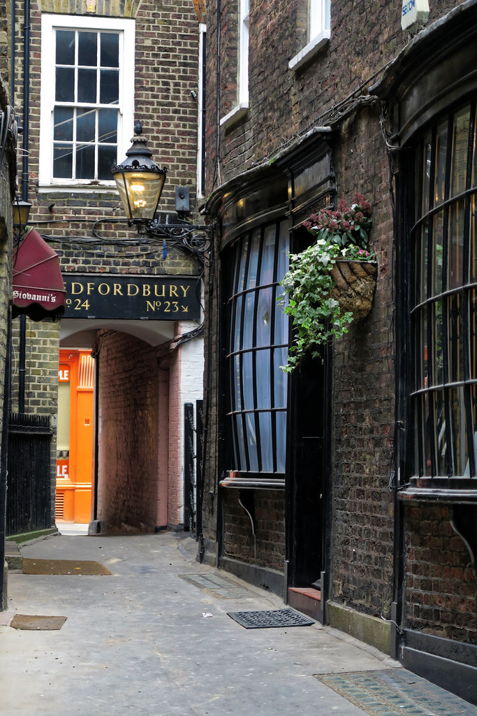 The entrance is in Goodwin’s Court, a passageway opposite the Fast Copy shop on Bedfordbury.